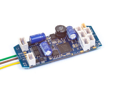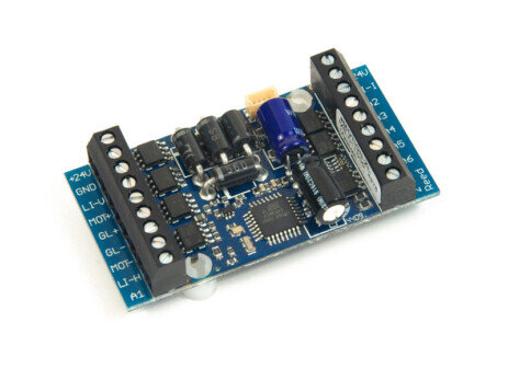 Lokdecoder mit bis zu 8 Ampere Fahrstrom und 10 Ampere Gesamtstrom für Loks mit bis zu 4 Motoren geeignet.